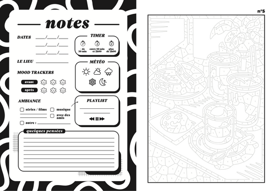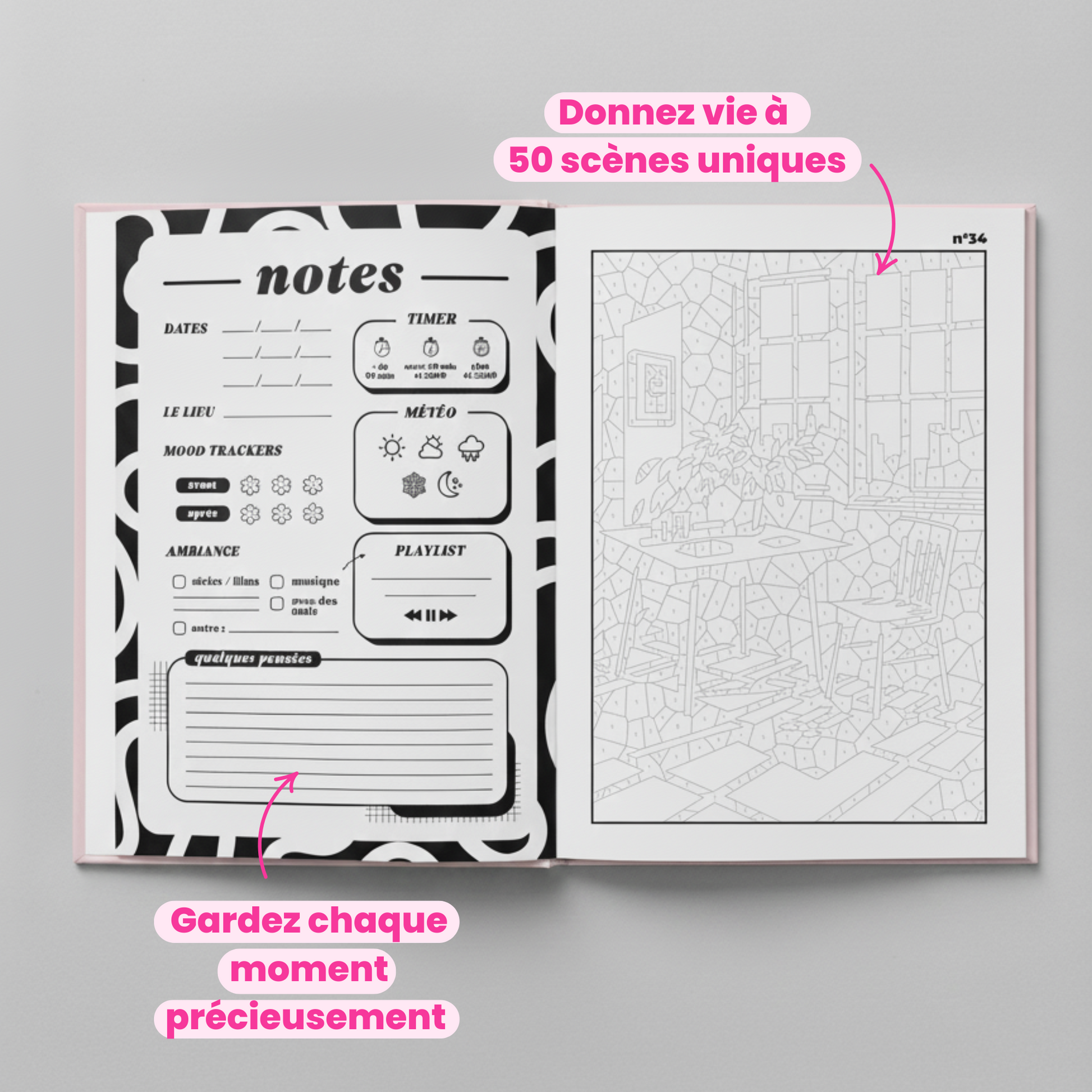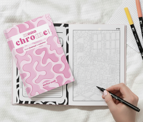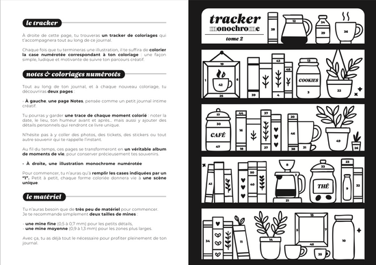 - 📖 Ouvrez délicatement votre journal Monochrome Tome 1 et choisissez le coloriage qui vous inspire.